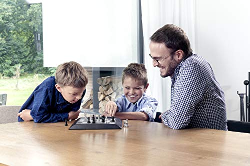 Comodo sistema di menu per una facile impostazione del sistema · Ampio display illuminato: Rappresenta l'intera scacchiera e i testi dell'aiuto e del sistema di menu · Scacchiera extra grande: Superficie di gioco 20 x 20 cm, con sensori extra-leggeri · Guida utente multilingue · Diverse modalità di gioco: Giocatori contro computer, giocatori contro giocatori, ecc. · Modalità di risparmio energetico migliorata · Collegamento dell'alimentatore · Rilevamento automatico dell'alimentatore per lo