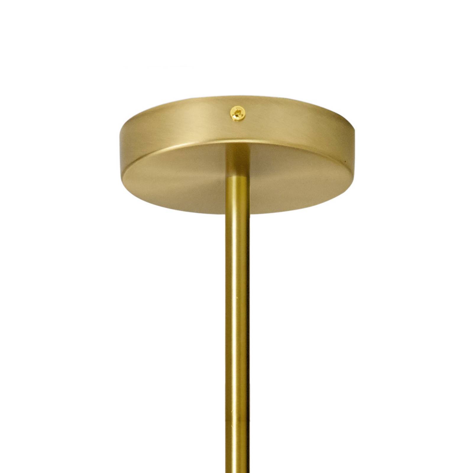 Linee rette in ottone e bianco - lampada a sospensione Jugen La lampada a sospensione Jugen a più luci è costituita da un lungo tubo di metallo fissato al soffitto con un rosone. Leggermente al di sopra dell'estremità inferiore dell'asta, un'altra asta metallica è fissata orizzontalmente e funge da supporto per i paralumi. Questi paralumi sferici sono realizzati in vetro soffiato smerigliato e nascondono ciascuno una portalampada E27, che può anche essere dotata di lampadine LED.