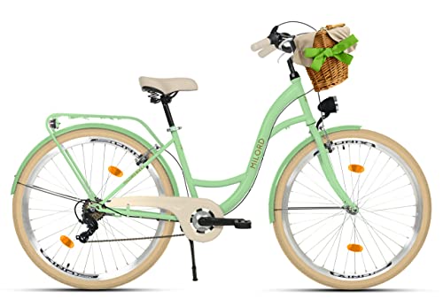 Milord Comfort, bicicletta con cestino in vimini, bicicletta olandese da donna, City bike, vintage, 28 pollici, crema menta, Shimano, verde crema, 28 pollici