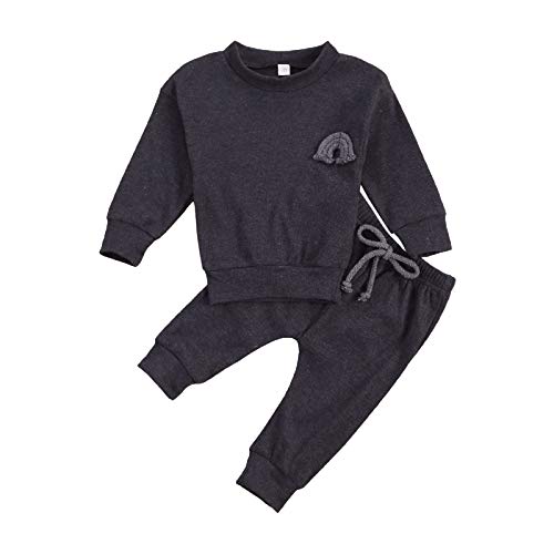 Milumilu Tuta Pantalone Neonato 0-24 Mesi 2 Pezzi Completo Bimbo Unisex in Cotone Felpa a Maniche Lunghe + Pantalone in Tinta Unita Ricamo Arcobaleno Elegante (Grigio Scuro, 6-12 Mesi)