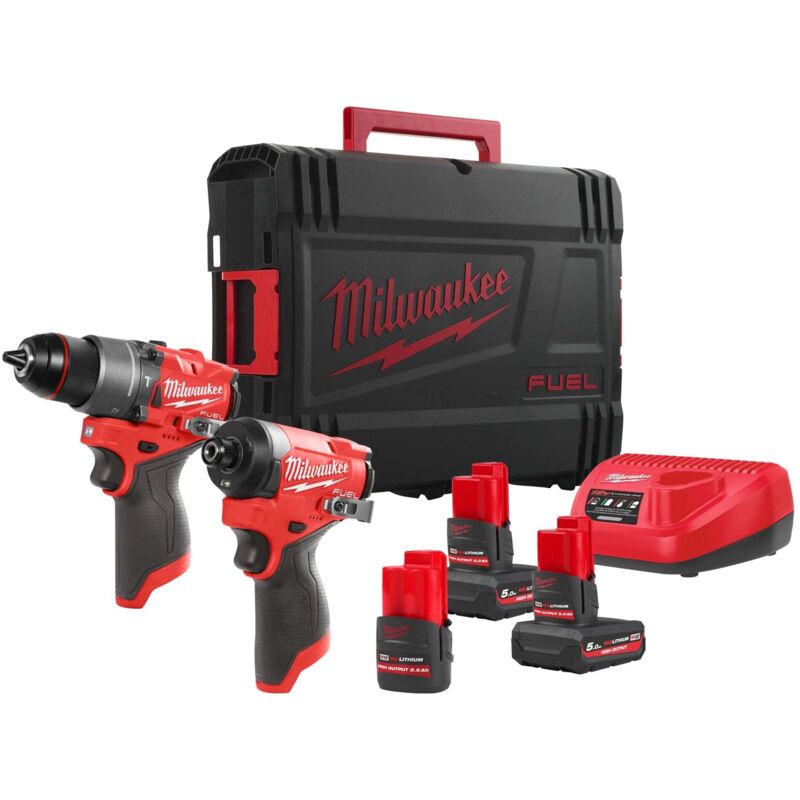 M12 fpp2a2-5253x - kit trapano con percussione + avvitatore ad impulsi + batterie high output 2 da 5ah + 1 da 2,5ah - milwaukee