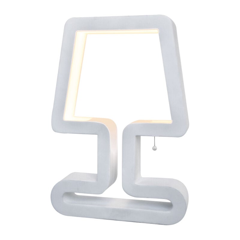 Collezione Logo FORMA DI LAMPADA PER UN LUME VERY COOL Lampada moderna da tavolo realizzata in alluminio e acrilico bianco a forma di lampada e interruttore a strappo. Sorgente luminosa a Led integrato da 12 watt, 977 lumen, temperatura colore 3000k (luce calda). Disponibile anche nella versione nera.