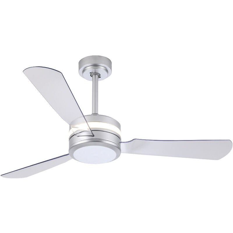 Collezione Garbi GODITI IL FRESCO IN SILENZIO Ventilatore da soffitto a LED con motore silenzioso a cinque velocità. Ha un'illuminazione LED 18 w, 1500 lumens, regolabile nella temperatura del colore, timer di spegnimento e funzione di rotazione inversa. Il motore è realizzato in acciaio con finitura argento e le sue quattro pale in policarbonato sono trasparenti. Ventilatore da soffitto ideale da installare in ambienti moderni.