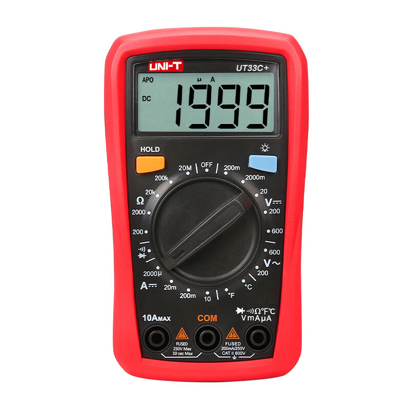 Multifunzionale] Questo multimetro può misurare la tensione CA e CC, la corrente CC, la resistenza, il diodo e la continuità del test. del circuito. Strumento e tester ideale per prese domestiche, fusibili, cablaggi, circuiti automobilistici, batterie uso generale e automobilistico... 【Facile da pulire. uso】 Con la funzione di conservazione dei dati, l'ampio schermo retroilluminato ti aiuta a prova chiaramente in luoghi bui. La funzione di indicatore di batteria scarica, supporto aperto in qualsiasi momento. 120 gradi e il cicalino di continuità renderlo più conveniente uso. 【Più sicuro】 Doppio fusibile anti-ustione, protezione completa da sovraccarico, protegge meglio la tua sicurezza. La custodia in gomma spessa rimovibile protegge il multimetro da piccole fuoriuscite e urti. [La confezione include] 1. Scatola esterna/2. Host prodotto/3. Batteria (9V)/4. Scheda di garanzia manuale/5. Cavo di prova/6. Sonda di temperatura (solo UT33C+) UT33C+ ha la funzione di test della temperatura