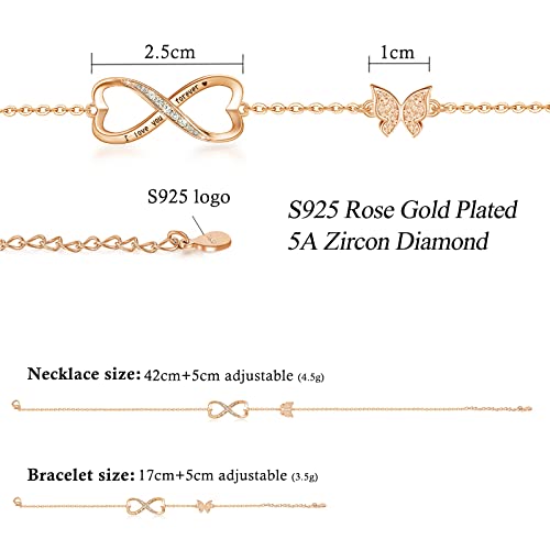 MINCHEDA Bracciale Collana Oro Rosa, Parure Bracciale Collana con Segno Infinito in S925, Set Gioielli Scintilla Zirconia Cubica Farfalla, Regalo per Lei, Donna- Regali Festa Della Mamma, San Valentine