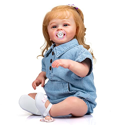MineeQu 24 pollici 60CM lifelike Dimensioni enormi Capelli ricci biondi radicati Bambole del bambino Reborn Bambole realistiche della ragazza del neonato Sorriso dolce con i denti che sembrano reali