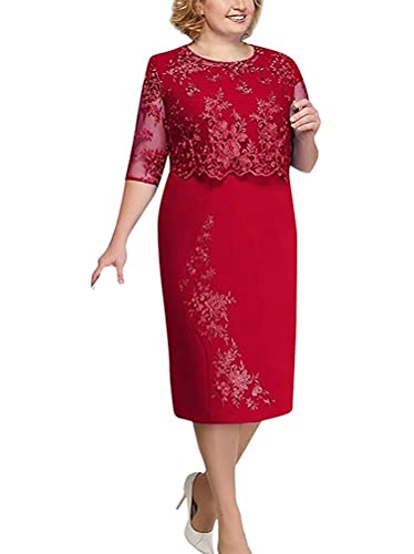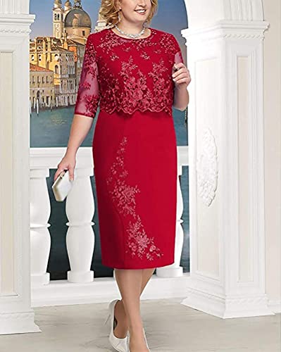 Minetom Abito Donna Floreale Pizzo Tinta Unita Elegante Girocollo Midi Vestito Cerimonia Festa Sera A Rosso 3XL