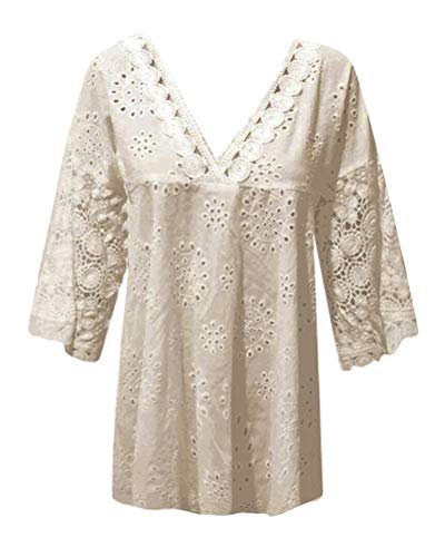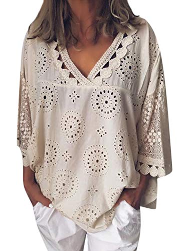 Minetom Camicetta Donna Pizzo Blusa Maniche Larghe A 3/4 Scollo V Elegante E Casual Camicia Pizzo Cut out Tinta Unita Shirt Albicocca XXL