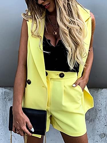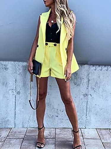 Minetom Completo da Donna Due Pezzi Slim Fit Blazer Elegante Cappotto Giacca Lunga e Pantaloncini con Tasche Giallo XS