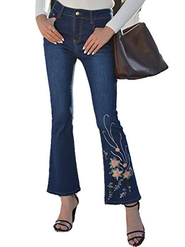 Minetom Donna Bootcut Jeans a Zampa di Elefante Pantaloni Vita Alta Elasticizzati Stretch Floreale Ricamato Denim Pantalone con Tasche F Blu M