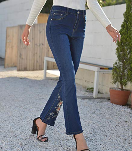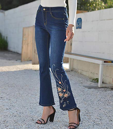 Realizzato in denim elasticizzato comodamente morbido. Squisito ricamo floreale, elegante e chic.