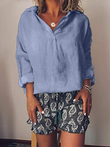 Minetom Donna Camicetta Magliette Maniche Lunghe Scollo V Inverno Autunno Elegante Casual Camicia Bottone Moda Tops Blu 48