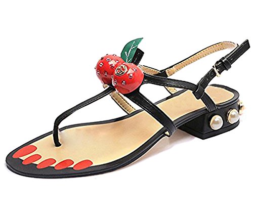 Minetom Donna Estate Dolce Ciliegia Perla T-Strap Flip Flop Sandals Peep Toe Scarpe Sandali Da Spiaggia Nero EU 38
