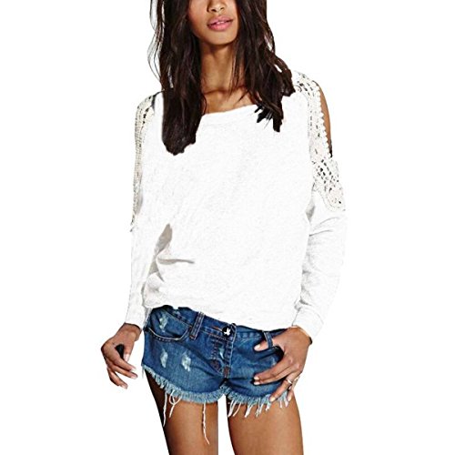 Minetom Donna Pizzo T-Shirt Camicetta Tops Maniche Lunghe off Shoulder (Bianco IT 44)