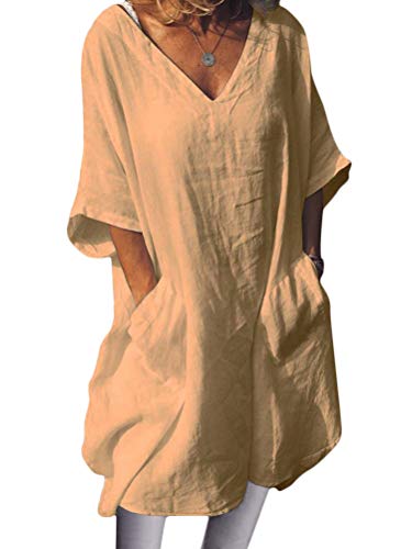 Minetom Donna Vestito Casuale Estivo Abito Maniche Corte Lino Vestiti Elegante Ampio Scollo a V Mini Abiti da Spiaggia Cocktail con Tasche A Cachi XXL