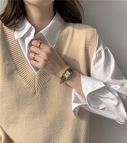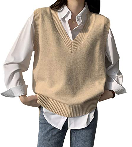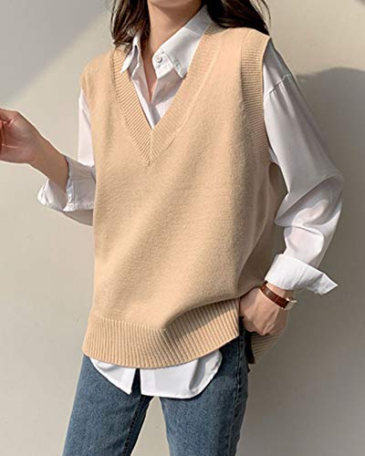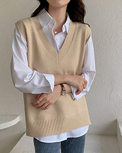 Minetom Gilet da Donna Ragazza Autunno V-Collo Senza Maniche Maglieria Maglione Sottile Ufficio Tops Confortevole Felpa in Maglia B Cachi 42