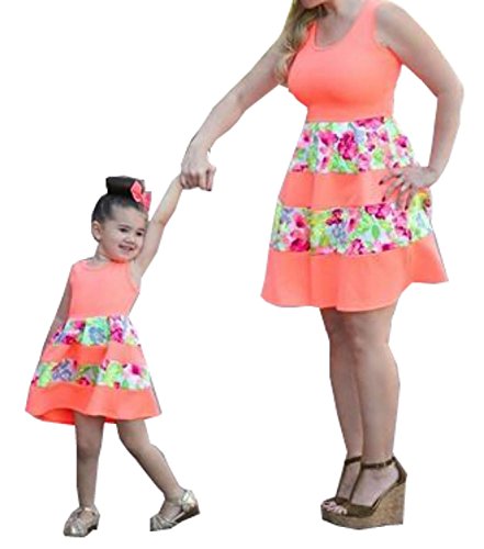 Minetom O-Collo Senza Maniche Vestito per Madre e Figlia Vestire Casual Genitore-Bambino A-Line Mini Prom Abiti Abito da Sera del Partito Arancione 140 (Ragazza)