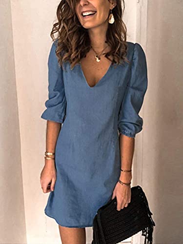 Minetom Vestiti Jeans Donna Estivi Vestiti Camicia Donna Maniche Corte Estate Casual Vestito Scoll A V Camicia Vestito Denim Vestiti Allentata Abiti Blu Scuro M