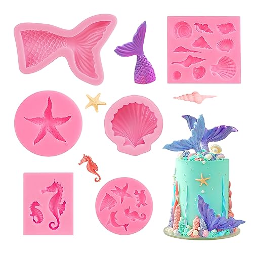 Mineup 6 pezzi Stampo Silicone Sirena e Conchiglia, 3D Animale Oceano Silicone Stampo, Stampi in Silicone per Natale Decorare Torte Tra Cui Coda di Sirena Cavalluccio Marino Stelle Marine (Rosa)