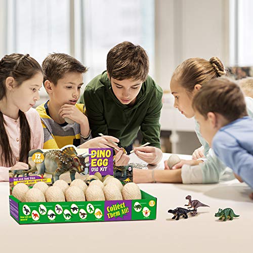 Il kit di scavo con dinosauro include: questo kit di scavo per uova di dinosauro include 12 uova di Dino (con un giocattolo unico di dinosauro in ciascuno), 12 scalpello/pennelli e 12 bellissimi biglietti per imparare a dinosauri colorati (uno per ogni Dino), 1 guida per le attività. È una scelta perfetta per il regalo di Natale per i bambini.