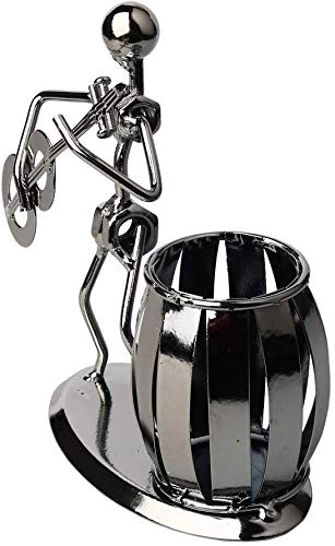 Design: organizzatore da tavolo con un portamatite a forma di botte accanto a un uomo di metallo che suona una chitarra elettrica. È un vecchio stile e una pentola per penne in metallo pesante