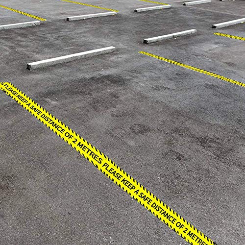 MINGZE Nastro di sicurezza, Giallo Nastro Bold Black Twill Segnaletico Nastro Adesivo Segnaletica Pavimento Distanza Sociale del Pavimento, “Please Keep A Safe Distance of 2 Metres” 48mm*25m