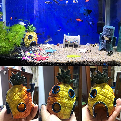 MINGZE 3 Pezzi Decorazioni per Acquario, Spongebob's casa di ananas Arredo Cartoon Ornamenti Tematici di Resina Accessori Fish Tank Ornamento con Ciottoli Luminosi
