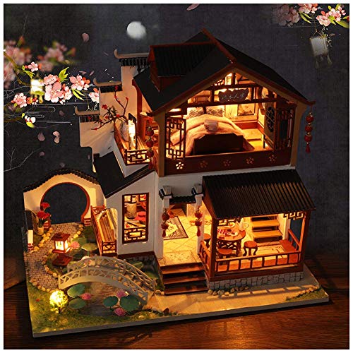 Miniatura casa delle bambole con mobili, kit casa delle bambole in legno fai da te più antipolvere e movimento musicale, giocattoli creativi per casa delle bambole in scala 1:24 per regalo per adulti