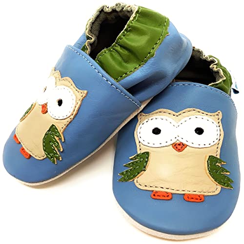 MiniFeet Premio Scarpe di Bambino di Cuoio Molli, Prime Scarpe da Passeggio, Simpatico Gufo Blu 12-18 Mesi