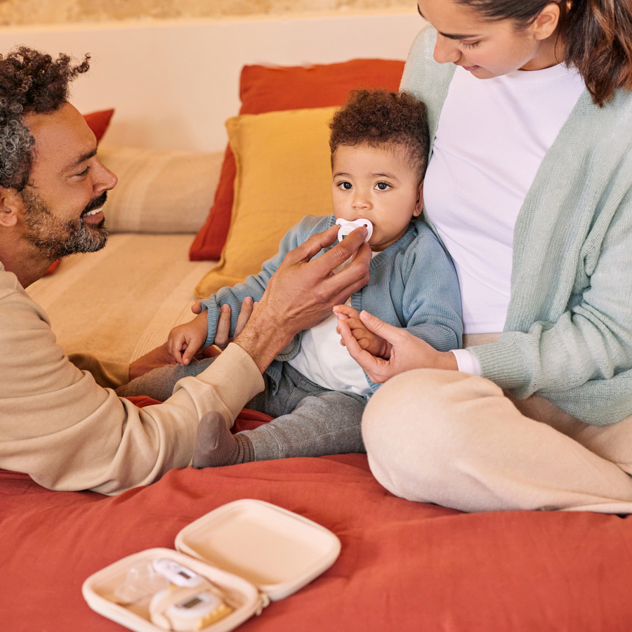 Dettagli del prodotto: Pratica valigetta con tre diversi termometri adatti a diversi scopi Un termometro corporeo con punta flessibile che fornisce una misurazione accurata e affidabile, per uso orale, ascellare o rettale, con un avviso sonoro in caso di temperatura elevata (oltre 37,8°C) Un termometro a ciuccio per la misurazione della temperatura orale, che può essere immerso nell'acqua, è lavabile, facile da usare e comodo per i bambini. Infine, un termometro da bagno a forma di simpatico pinguino, che indica la temperatura dell'acqua e dell'ambiente ed è un divertente compagno di giochi. Un segnale di avvertimento appare quando la temperatura dell'acqua raggiunge una temperatura molto alta o molto bassa. La custodia è impermeabile per proteggere al meglio i termometri e facilitarne la pulizia. All'interno sono presenti degli elastici per tenere ogni termometro al suo posto e mantenerlo protetto e organizzato Incluso nella fornitura: 1x custodia 1x termometro per il corpo 1x termometro a manichino 1x termometro da bagno