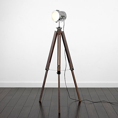 MiniSun, lampada da terra elegante e vintage in legno marrone e metallo lucido cromato a figura di un treppiede in stile industriale e hollywoodiano retro, lampada da terra Dunkelbraun