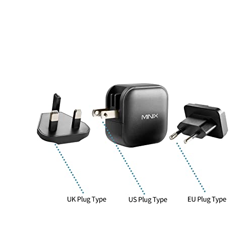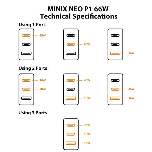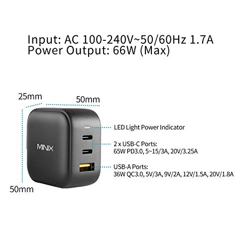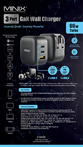 MINIX 66W USB caricatore da parete, Turbo 3 porte GaN caricabatterie universale rapida. 2 x USB-C PD 3.0, 1 x USB-A, per telefoni cellular, tablet, laptop e altro ancora. (NEO P1)