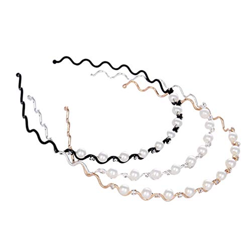 Minkissy Fasce per capelli a forma di onda 3 pezzi con strass di perle fasce per capelli principessa cerchietto per capelli vintage (bianco nero e dorato)