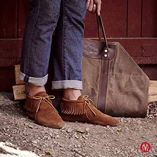 Stivaletto in camoscio con punta a mocassino e allacciatura in pelle bovina al collo frange