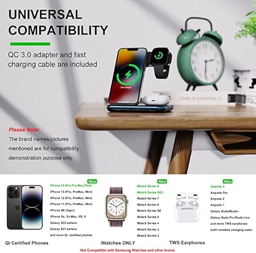 RICARICA VELOCE QC 3.0: È incluso un adattatore di alimentazione da 18W e un cavo USB C. Il base ricarica wireless può caricare telefono, iWatch e AirPods contemporaneamente. L'uscita del caricabatterie wireless raggiunge fino a 15W / 10W / 7.5W / 5W per i telefoni, 3W per gli AirPods e 2.5W per la ricarica dell'iWatch. Offre un'esperienza di ricarica eccezionalmente veloce e wireless (Distanza di trasmissione fino a 8mm/0,31inch)