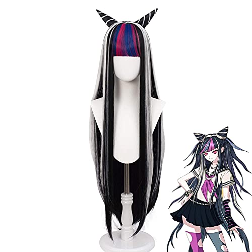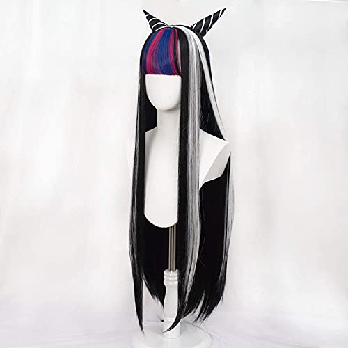 Mioda Ibuki Parrucca per Danganronpa Cosplay con corna 70 cm nero misto arcobaleno anime Halloween Cosplay parrucca per donne ragazze con cappuccio