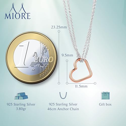 Miore Collana Donna Argento Sterling 925, Catenina Rodiata con Ciondolo Cuore Placcato Oro Rosa. Collana Lunga Cm 42 + Cm 5 di Estensione. Pendente anallergico.