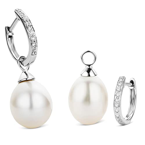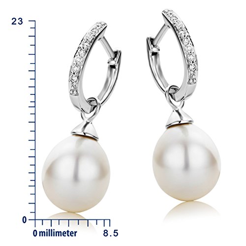 Miore - Orecchini Cerchio con Diamanti e Perle Naturali in Vero Oro Bianco 9KT 375, Orecchini Pendenti con Perle coltivate e Brillanti, Boccole anallergiche - perno passante e farfalla a pressione.