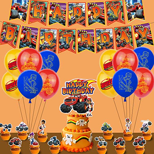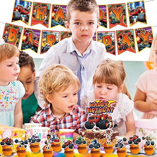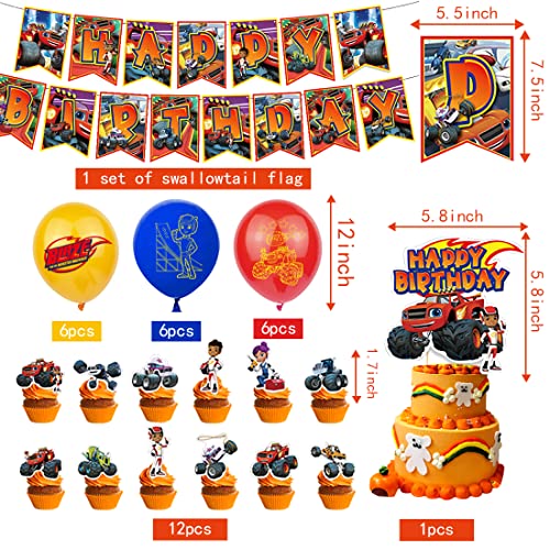 [Pacchetto completo di decorazioni per feste da 46 pezzi]: il pacchetto di decorazioni per feste Blaze and the Monster Machines include: 1 set di bandiera a coda di rondine (15 carte di carta), 18 palloncini (6 gialli 6 rossi 6 blu), 1 torta, 12 cupcake.