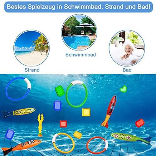 ▶ Set di immersioni colorate. Include 4 anelli tuffo in Pcs, siluro tuffante 4 pezzi, 3Pcs Water grass, 8Pcs Diving diamond. I giocattoli per immersioni sono molto vivaci, colorati e molto facili da trovare. Ai bambini piacerà buttarli e inseguirli in piscina.