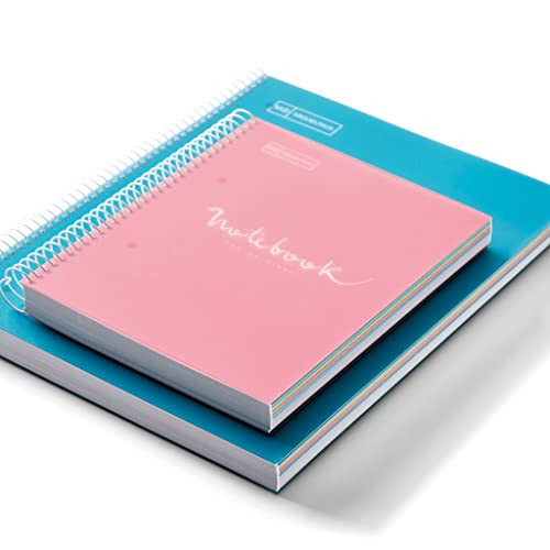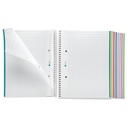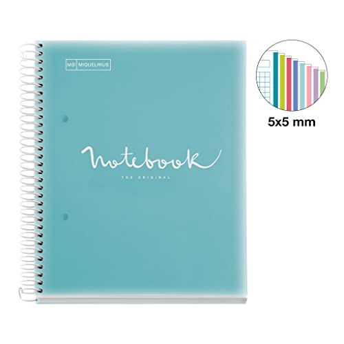 Miquelrius - Quaderno a spirale microperforato, copertina in polipropilene traslucido, formato A5, 148 x 210 mm, 2 fori, 160 fogli da 90 g/m² e 8 bande colorate, quadretti da 5 x 5 mm, blu cielo