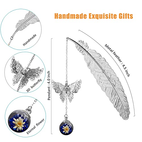 MIRFURT Segnalibro in Piuma di Metallo Segnalibri a Forma di Piuma,Segnalibri Vintage Classici con Farfalla 3D e Ciondolo Fiore,segnalibro per lettori,adulti,bambini e studenti,argento,fiore blu