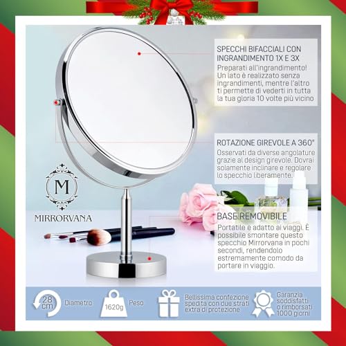Mirrorvana Specchio d'ingrandimento x3, specchio rotondo per il bagno, specchio da tavolo per il trucco con rotazione a 360, specchio d'ingrandimento sul piede, 3 volte e 1 volta, 18 cm (28 cm)
