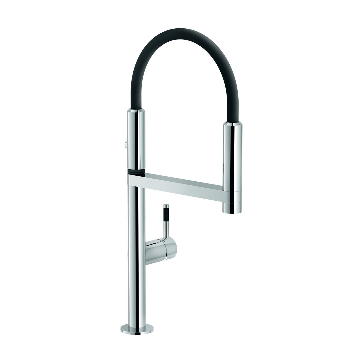 In ottone cromato lucido, canna alta. Installazione in appoggio sul lavello o piano cucina. Indicato per facilitare il riempimento di contenitori alti. L'apertura con cartuccia a doppio scatto garantisce risparmio d'acqua. I dischi ceramici garantiscono la durata nel tempo