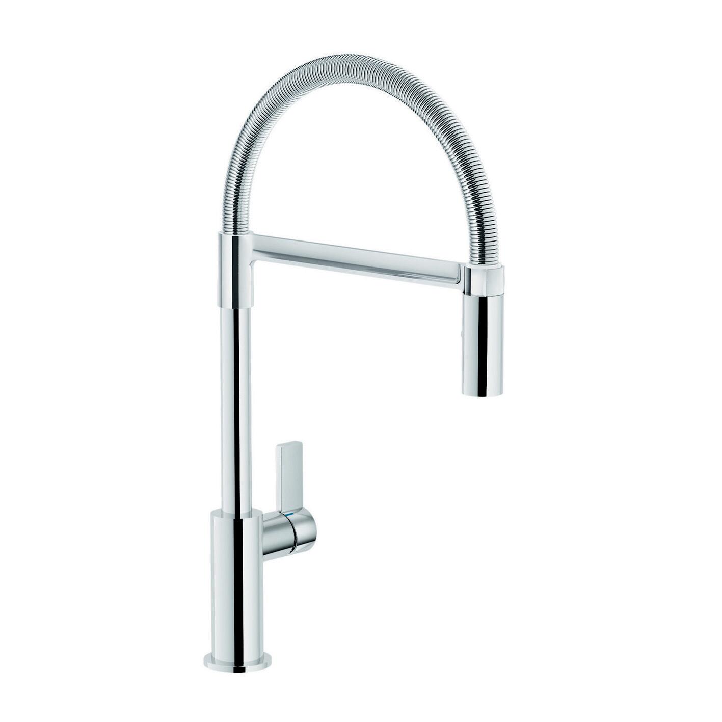 In ottone cromato lucido, canna alta. Installazione in appoggio sul lavello o piano cucina. Indicato per facilitare il riempimento di contenitori alti. L'apertura con cartuccia a doppio scatto garantisce risparmio d'acqua. I dischi ceramici garantiscono la durata nel tempo