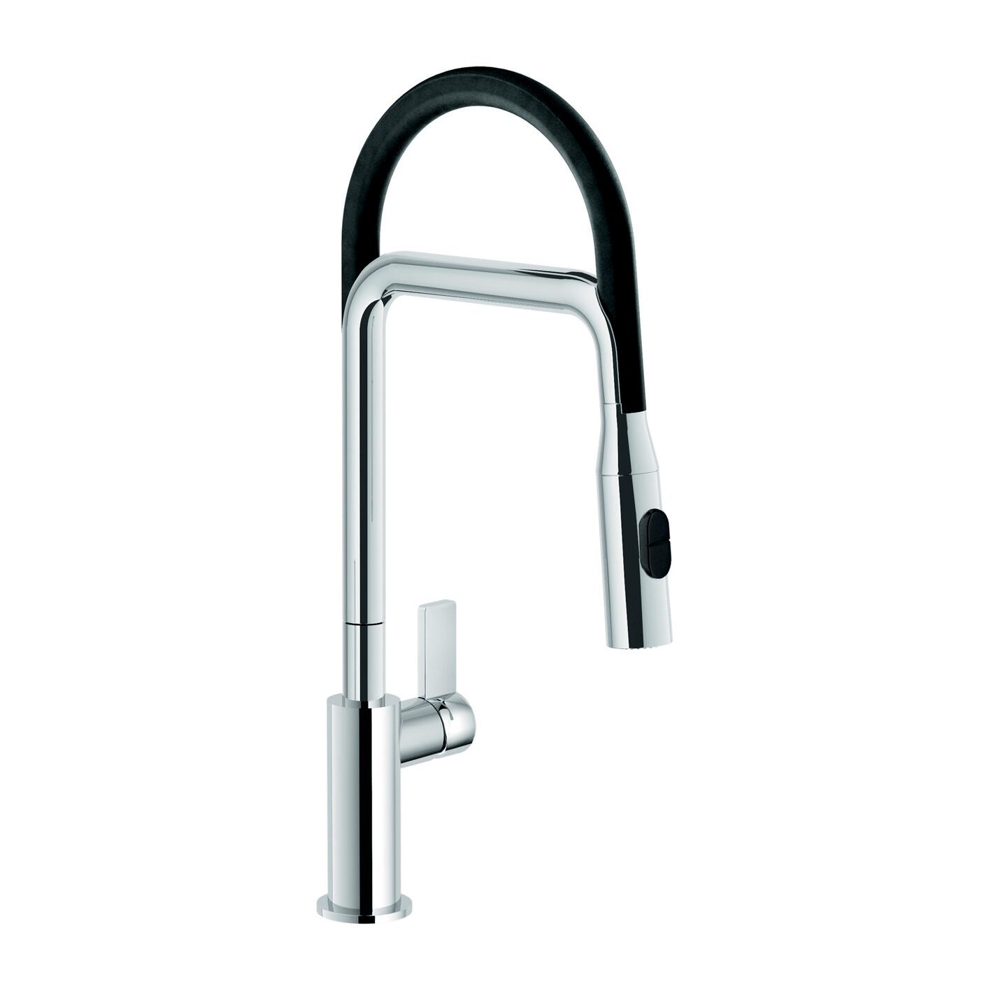 In ottone cromo/nero lucido, canna alta. Installazione in appoggio sul lavello o piano cucina. Canna alta estraibile, ideale per direzionare facilmente l'acqua. La doccetta estraibile è dotata di doppio getto per cambiare la modalità di erogazione. I dischi ceramici garantiscono la durata nel tempo. La funzione doppio getto permette di cambiare la modalità di erogazione del getto