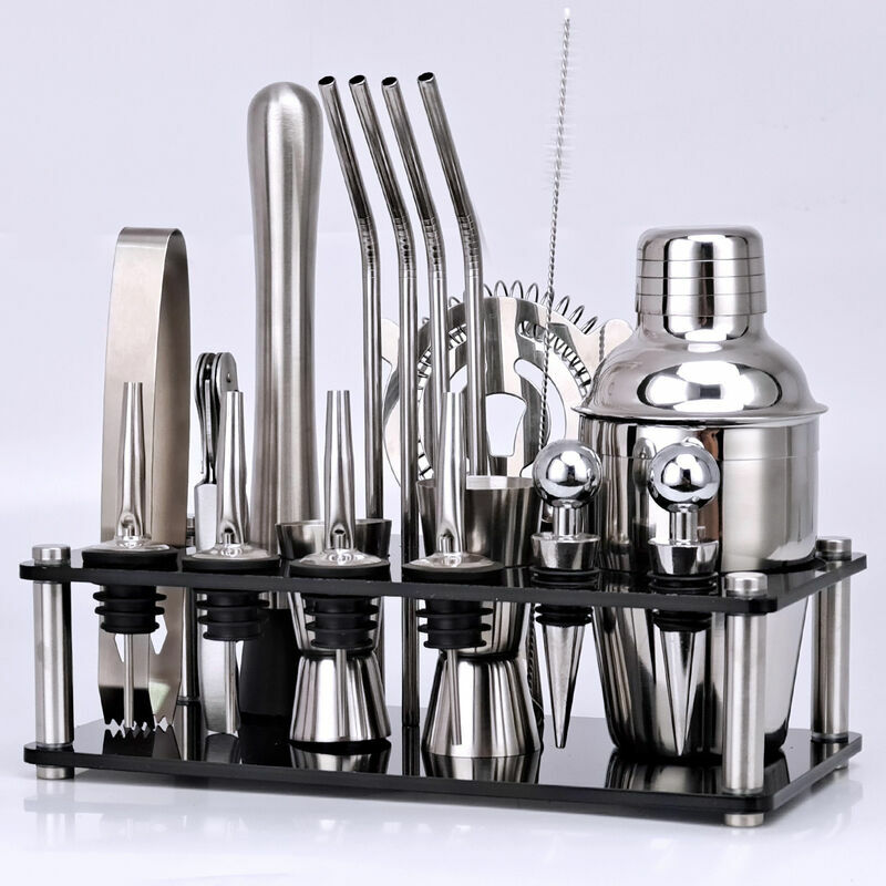 Set di shaker per cocktail - Set da barman all-in-one da 20 pezzi, kit di strumenti per la miscelazione per la preparazione. a uno standard da barista professionista., [FACILE DA CONSERVARE E VISUALIZZARE] L'elegante design a semicerchio, l'ambiente in materiale di bambù ecologico e le comode fessure per gli attrezzi mantengono i tuoi strumenti da barista organizzati e facilmente accessibili. Niente più disordine nei cassetti e negli armadietti della cucina. Che tu stia allestendo un bar a casa o al lavoro, questo set da barman con supporto è un'ottima opzione. [SICURO E DUREVOLE] Realizzato in acciaio inossidabile alimentare di alta qualità, questo kit da barista professionale è impermeabile, antiruggine, facile da pulire e lavabile in lavastoviglie. Progettata con cura, la superficie del prodotto non è facile da mantenere, può essere pulita e preparata rapidamente per i prossimi drink. [KIT PERFETTO PER TUTTI] Che tu sia un barista professionista o un dilettante, sia che tu voglia
