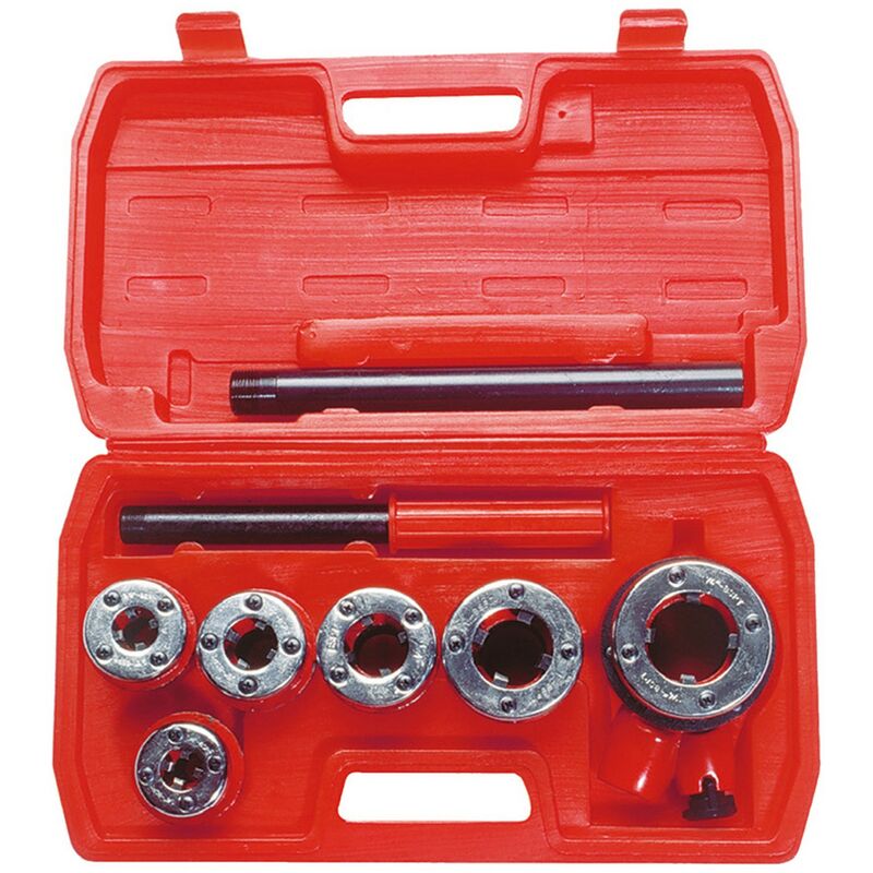 In valigetta plastica. filiere con filettatura da 1/4'-3/8'-1/2'-3/4-1'-1 1/4', portafiliere reversibile, prolunga per cric.8 pezzi