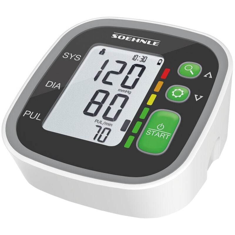 Misuratore di pressione sanguigna Systo Monitor 300 Soehnle 68099 misurazione completamente automatica del polso e della pressione sanguigna sulla parte superiore del braccio. Dotato di visualizzazione delle aritmie cardiache, schermo LCD XL (4,9 x 7,3 cm): sensore sistolico, diastolico, pulsazioni e movimento - Valore medio degli ultimi 3 valori misurati - 60 posizioni di memoria per profilo per 2 utenti con modalità ospite inclusa (senza memoria) - Classificazione dei valori misurati secondo l'OMS su una scala di colore verde-giallo-rosso - Comodo bracciale (da 22 a 42 cm) con ausilio di posizionamento. Tipo: monitor della pressione sanguigna. Materiali: plastica. Colore: bianco / nero. Dimensioni: P 17,7 x L 9 x H 13,5 cm. Batterie incluse: 4 x 1,5 V (AA). Peso netto: 0,6 kg.