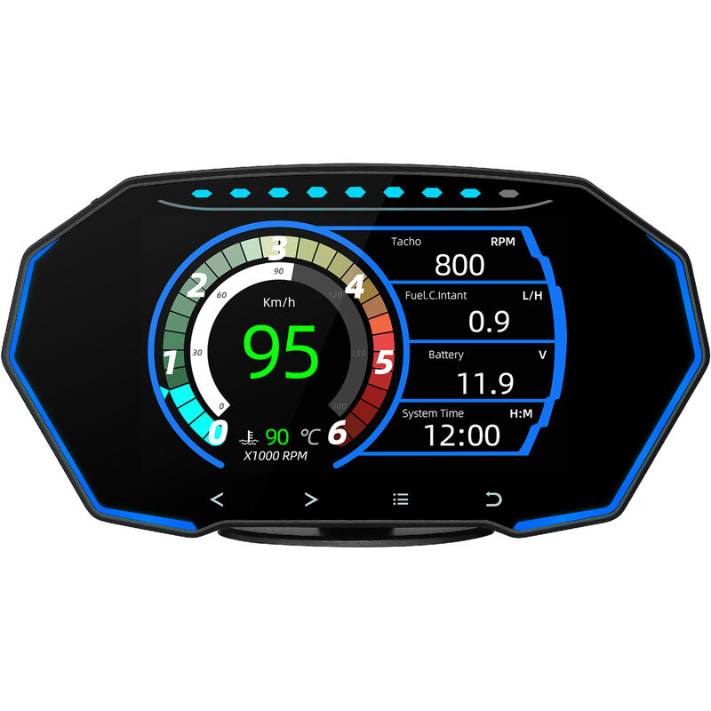 Questo prodotto legge i dati di guida del veicolo attraverso la piattaforma OBDⅡ del computer ECU dell'auto, come velocità del veicolo, velocità di rotazione, consumo di carburante, temperatura dell'acqua, voltaggio, ecc., e legge istantaneamente le informazioni di guida a condizione che l'ampio il campo visivo non si sposta durante la guida dell'auto, in modo da evitare che il guidatore si trovi Guardare lo strumento in basso durante la guida influisce sulla sicurezza, questo prodotto non riscrive alcun dato nella ECU. Il computer di guida OBD per uso generico è dotato di un dispositivo di rilevamento guasti molto potente. Il sistema visualizza chiaramente le informazioni sull'errore sotto forma di testo e ha la funzione di eliminare l'errore e leggere l'intero display delle informazioni sul flusso di dati del veicolo e così via. Caratteristiche: F11 è la nuova versione con schermo da 4 pollici e pulsanti touch. Luce d'atmosfera fresca e respiratoria con 7 tipi di regolazione del